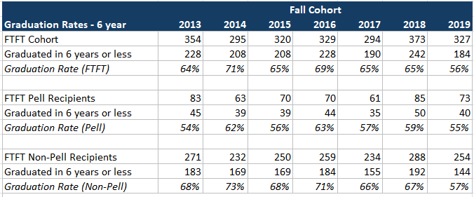 Graduation rates represent the number of first-time, full-time undergraduate, degree-seeking students in a fall cohort who graduate in either 4, 5, or 6 years from the university. The selected methodology follows the federal compliance reporting standards under the Inter-Postsecondary Data System (IPEDS) :