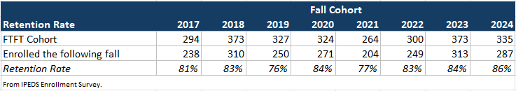 Retention rates indicate the number of first-time, full-time students (FTFT) who started in a fall semester and returned the following fall semester. We follow the methodology used for federal compliance reporting standards under the Integrated Postsecondary Data System (IPEDS).